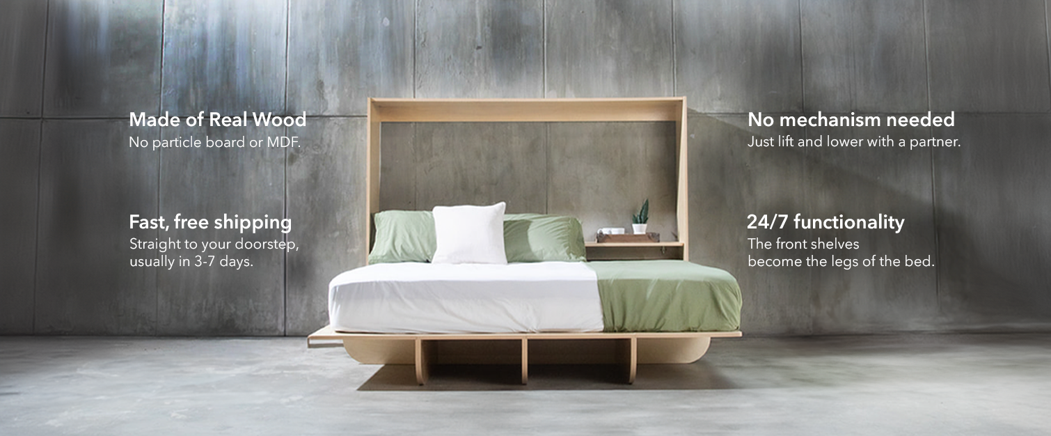 The YouLift bed by Lori Beds is our most affordable, mechanism-free Murphy bed. Made from real wood, simply lift and lower the platform with the strength of you and a partner. The shelves on the front of the bed act as legs when the bed is lowered, and the headboard shelf provides additional storage. The YouLift bed is designed for simple assembly, arrives straight to your doorstep, and comes with a lifetime warranty.