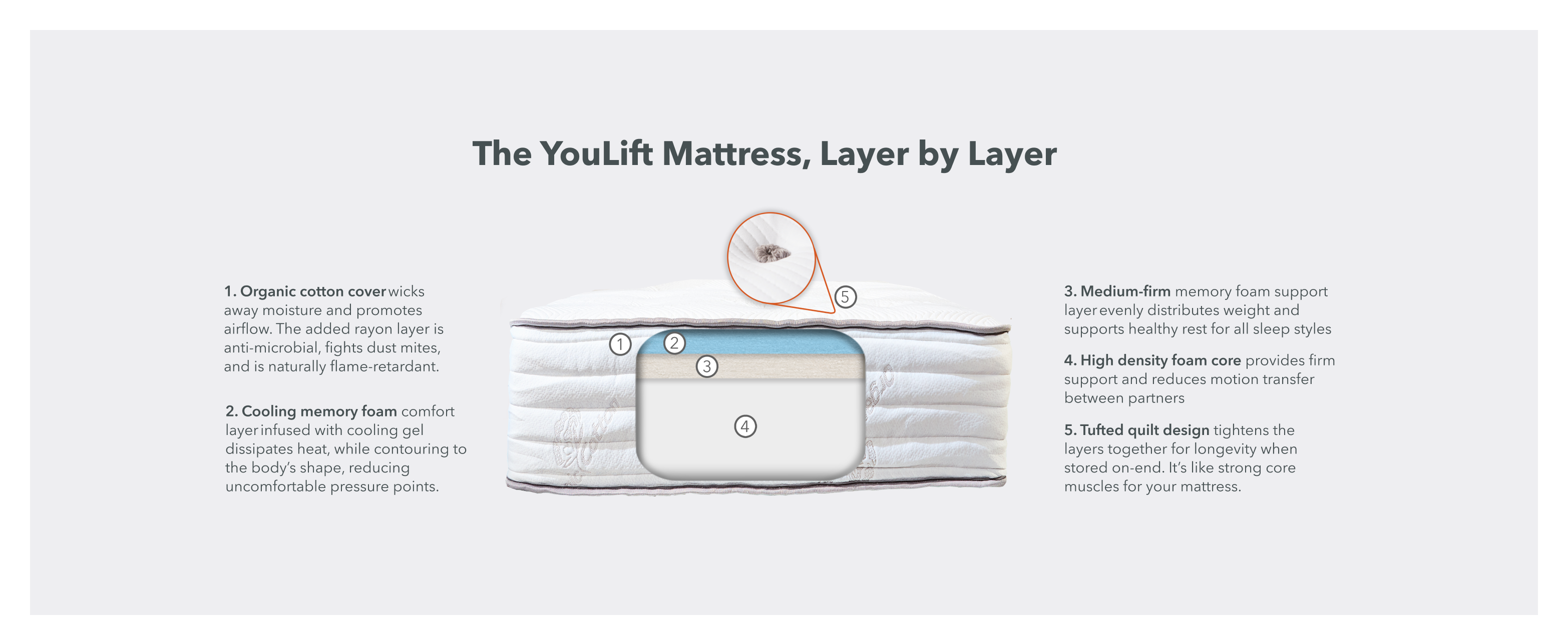 We partnered with a 100-year-old American mattress manufacturer to design and hand-make each YouLift Mattress. By combining healthy materials, modern technology, and old-school craftsmanship, we’ve made the YouLift Mattress an all-around winner.